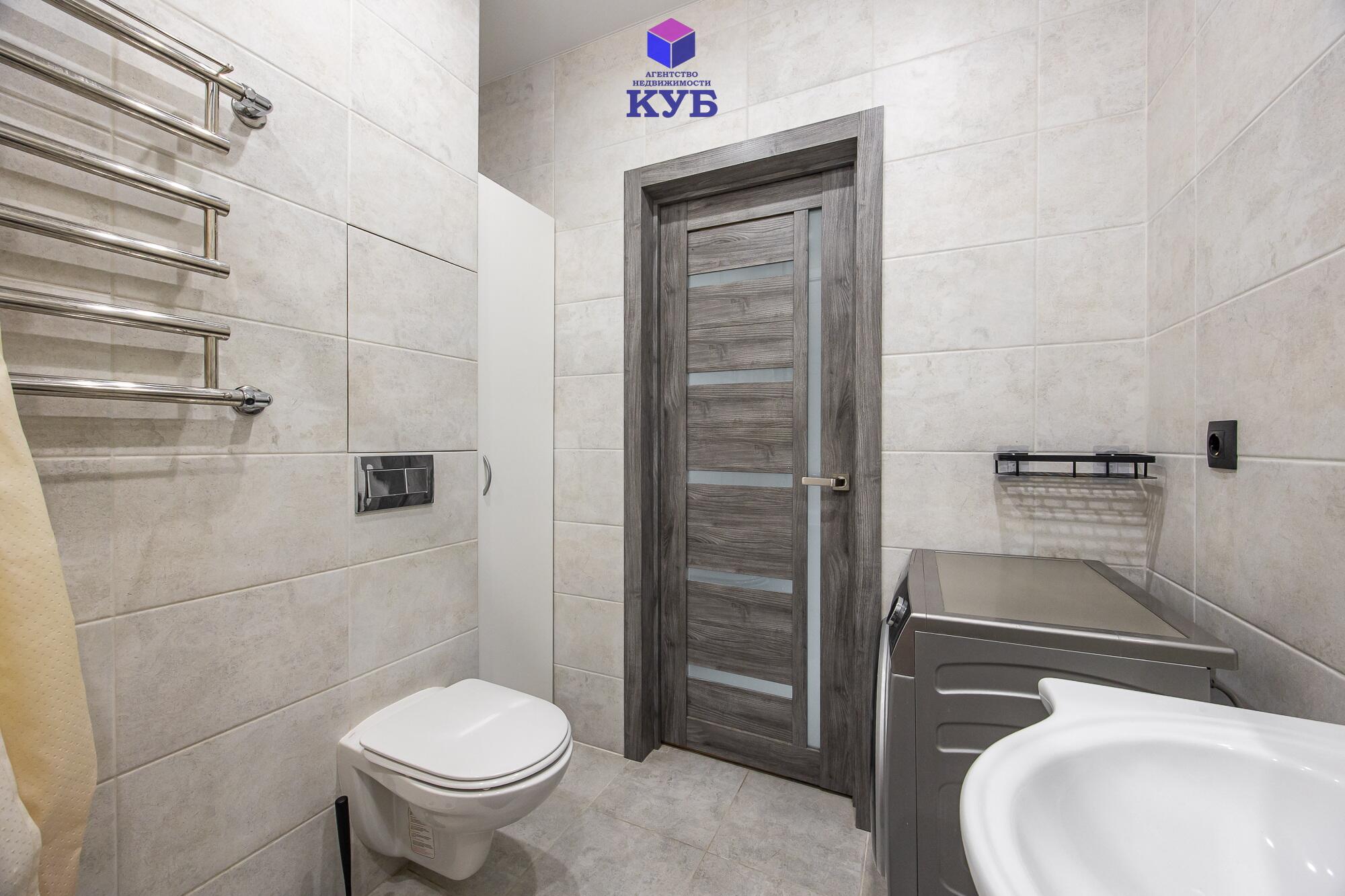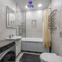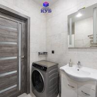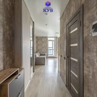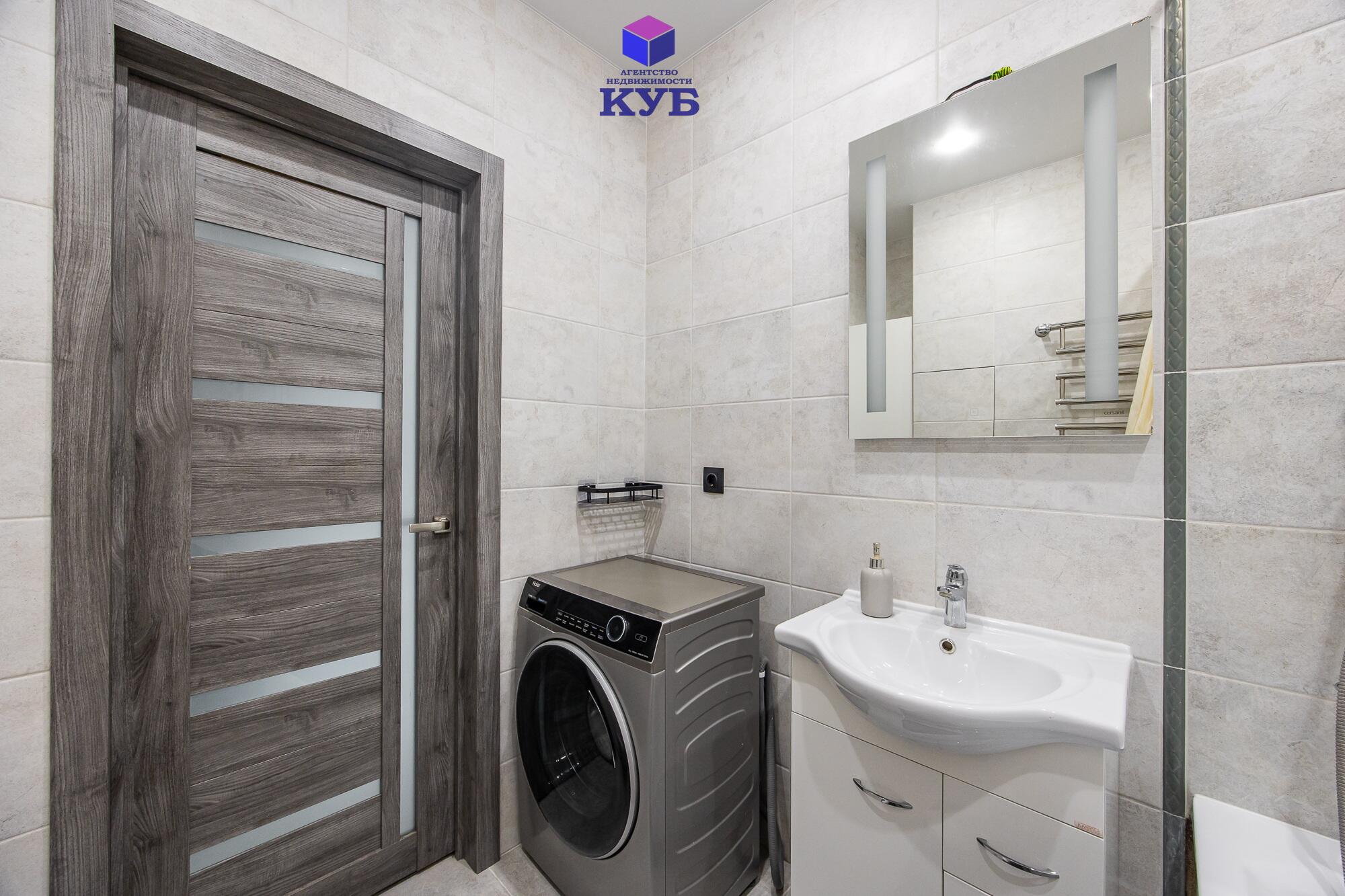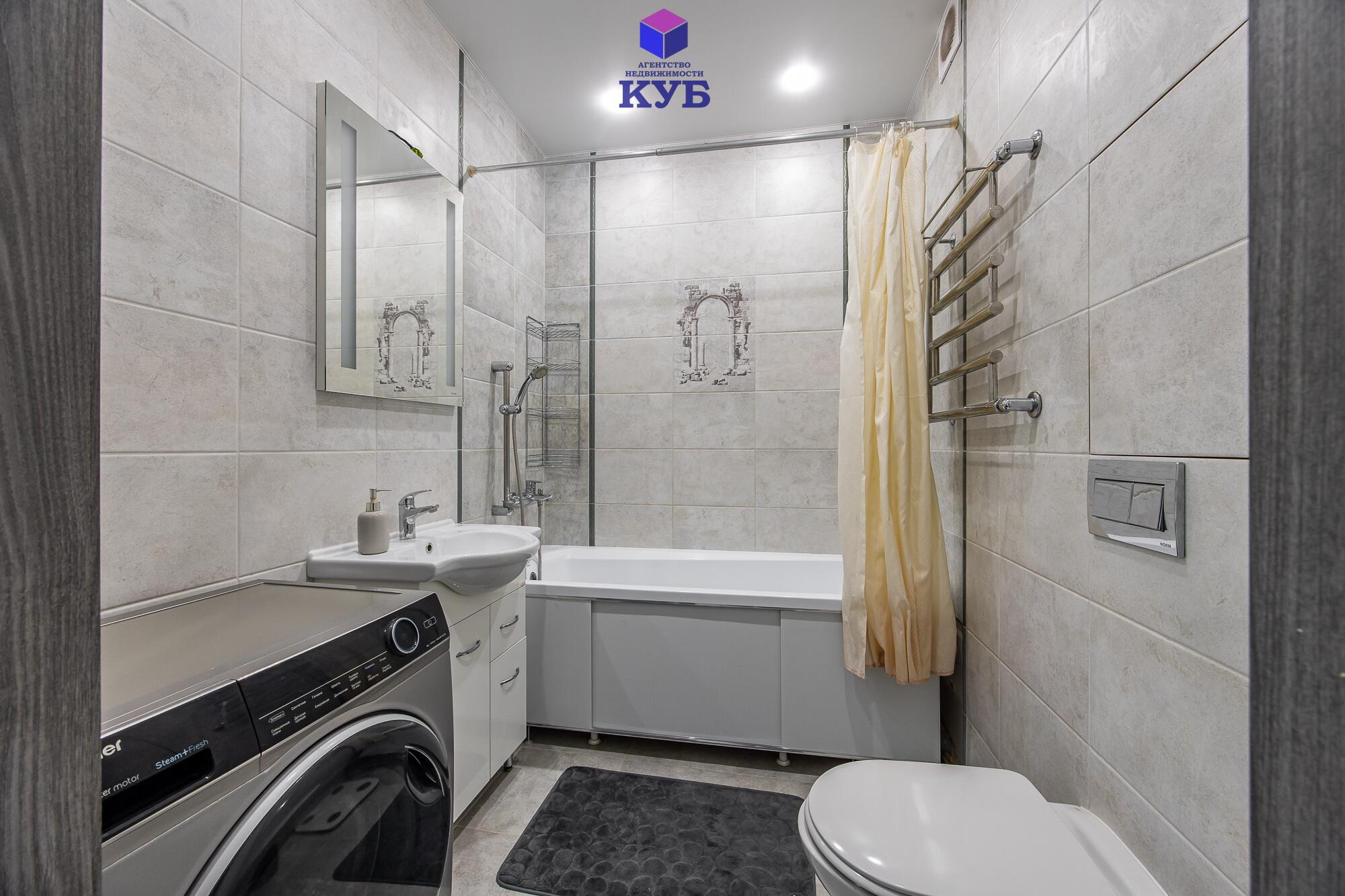 Стеклопакеты ПВХ 2-камерные (3 стекла), на лоджии – 1-камерный. Встроенная кухня с 4-конфорочной варочной панелью и духовым шкафом HANSA, холодильником BOSCH, барной стойкой и стульями. Пол ламинирован, потолки натяжные. Прихожая вмещает шкаф-купе и 2 комода, при этом остаётся широкое пространство. Санузел просторный, имеет всё стандартное оборудование: ванну, унитаз-инсталляцию, умывальник с тумбой и зеркалом, также остаётся шкаф в нише, место под стиральную машину с действующими выводами.