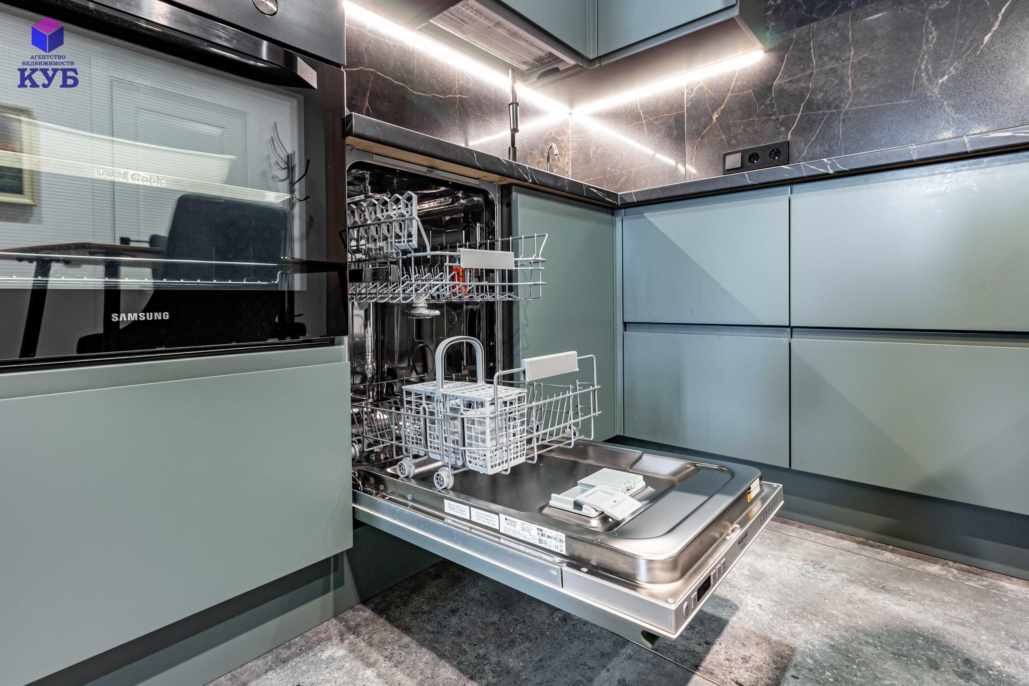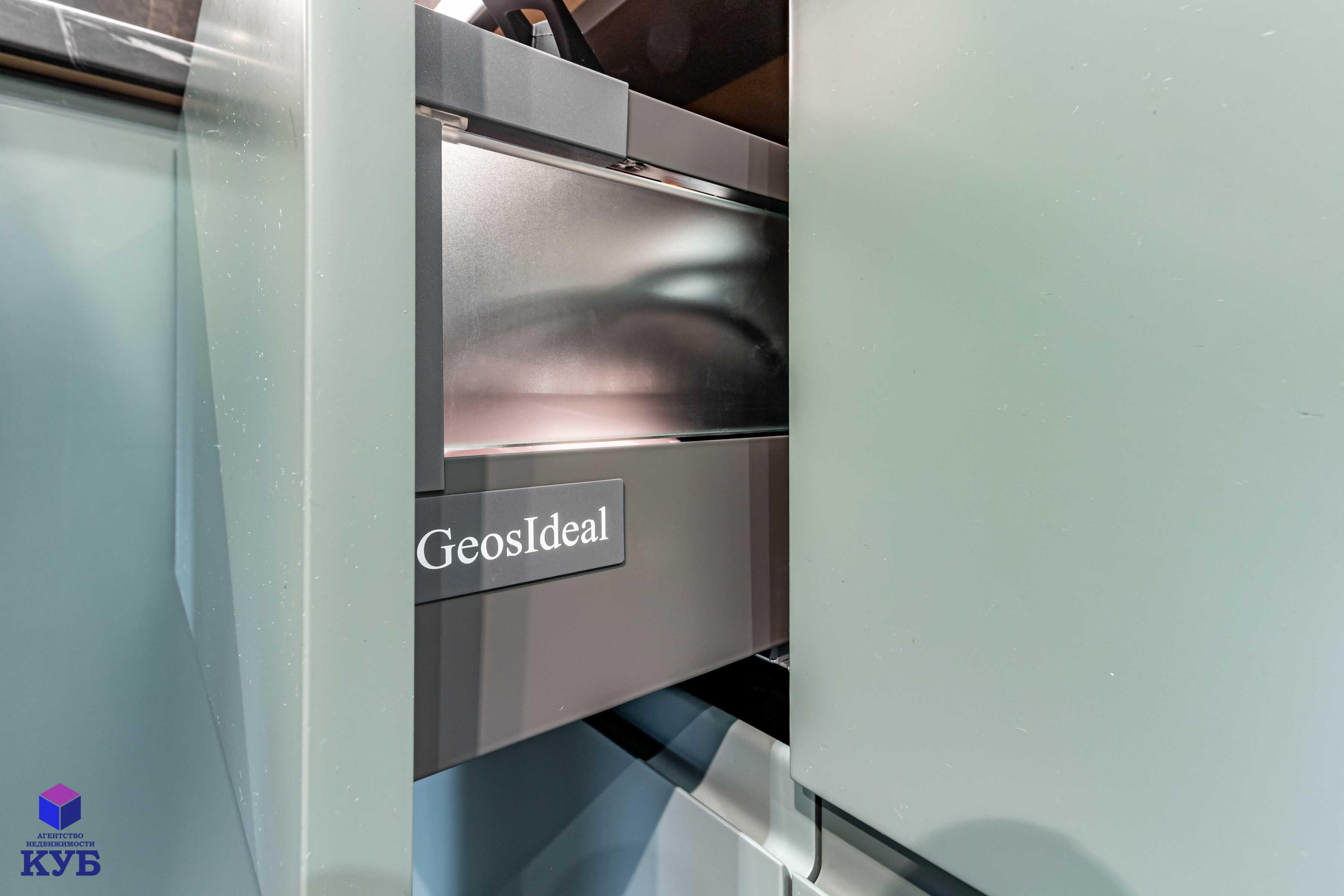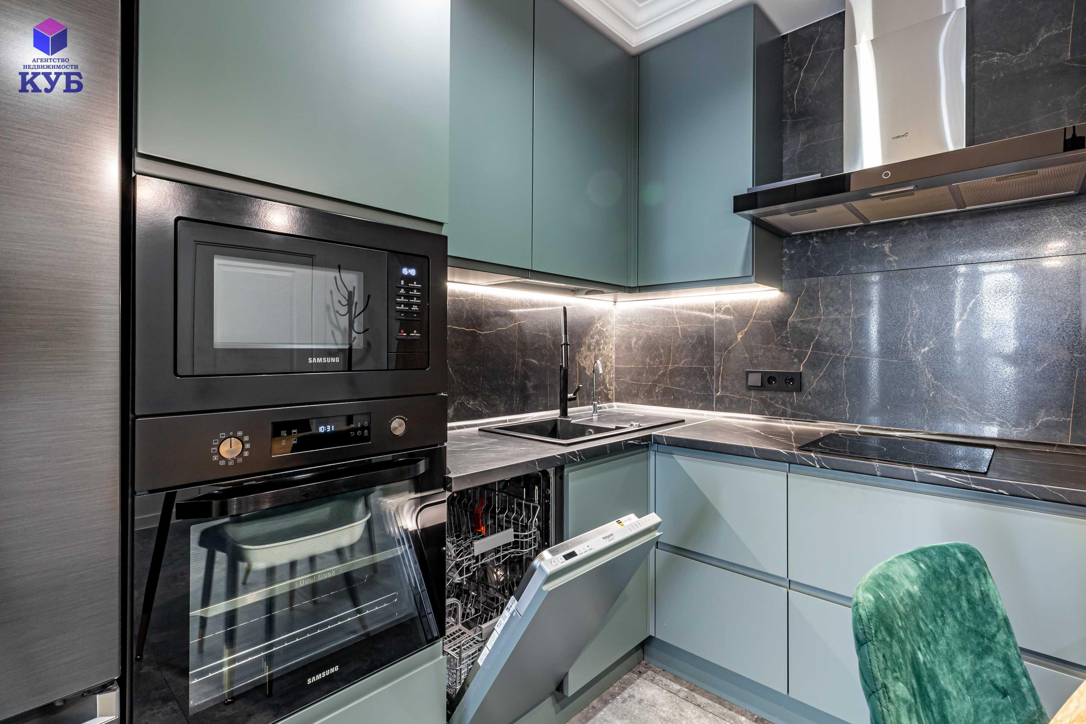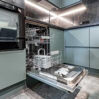кухня Geos Ideal, крашеные фасады, доводчики и фурнитура Blum, мойка и смеситель Deante, вытяжка CATA, cистема обратного осмоса, духовой двухзонный шкаф Dual Cook, холодильник Samsung инверторный No Frost с лицевыми панелями из металлопласта;