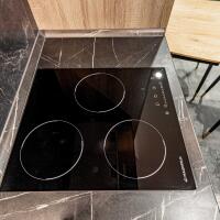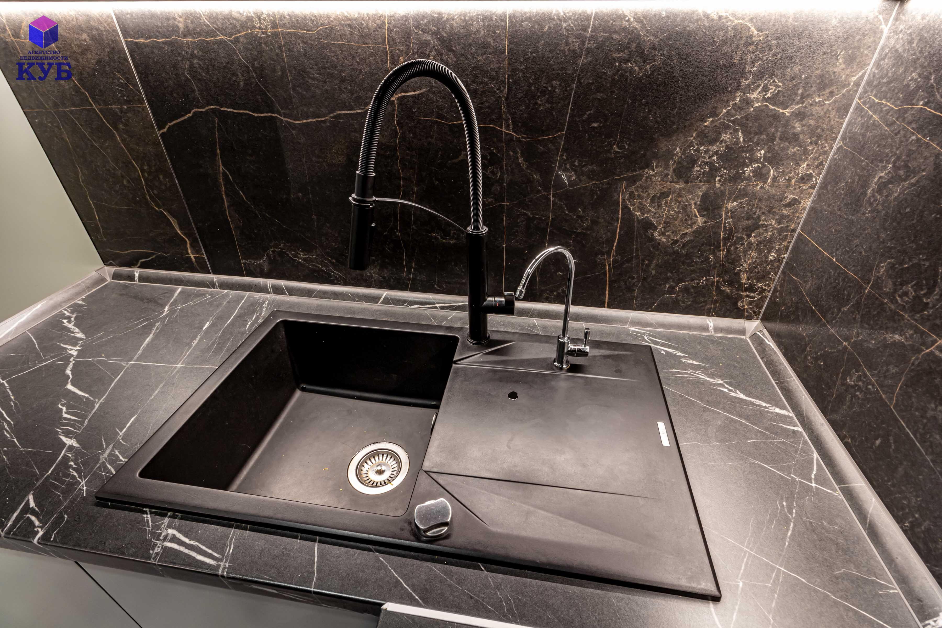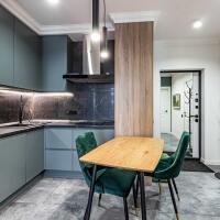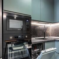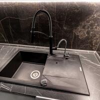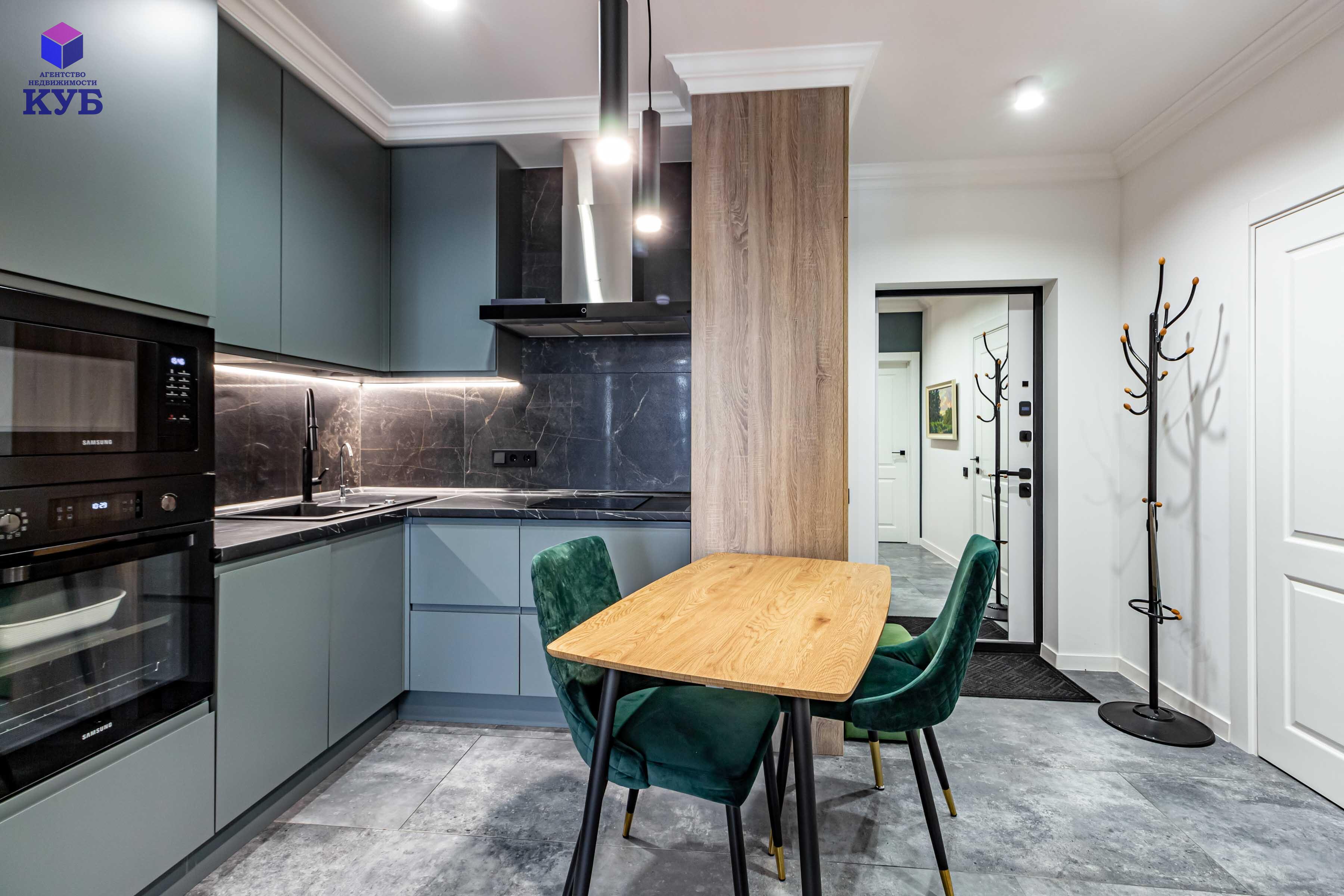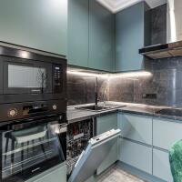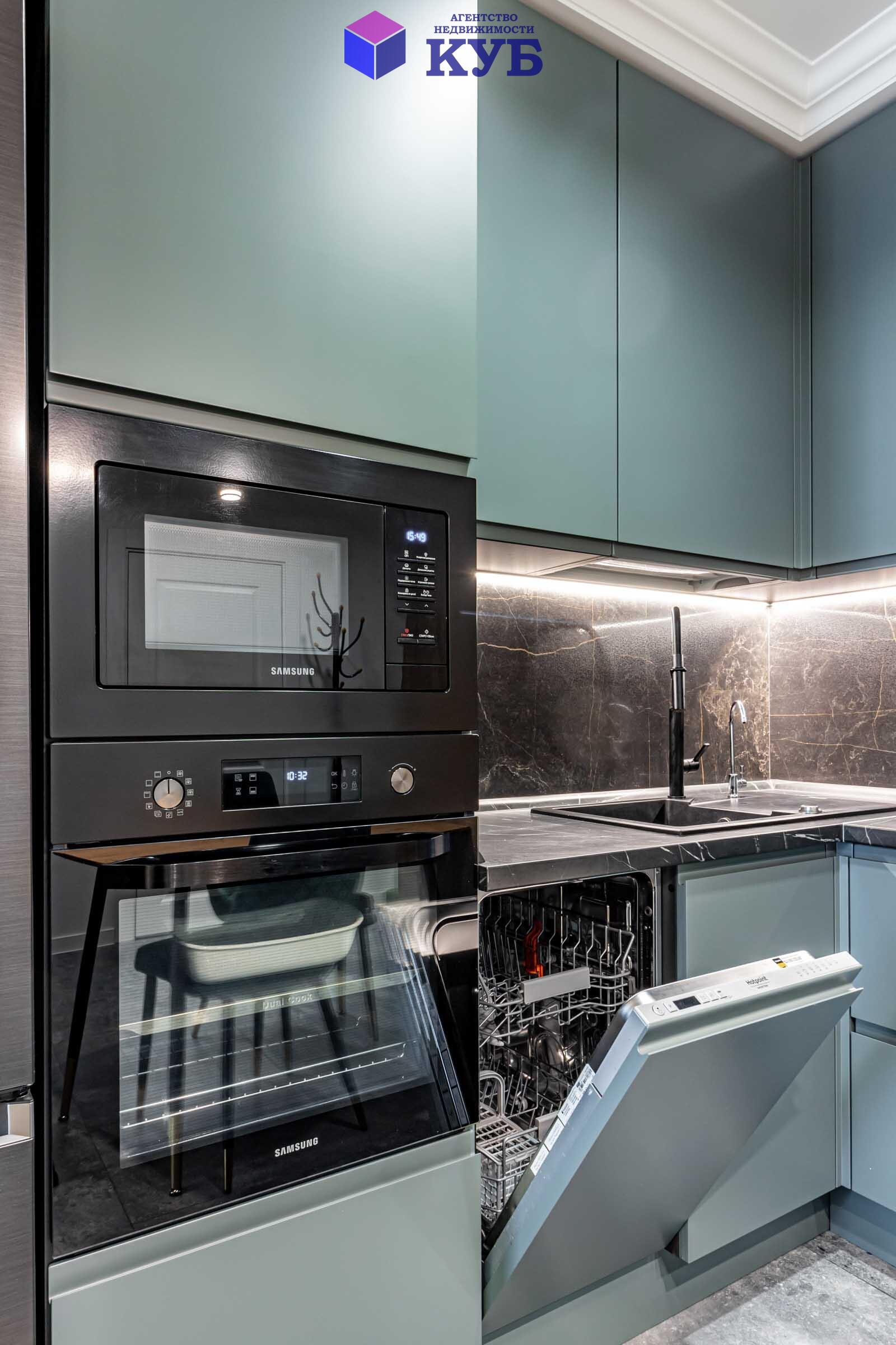кухня Geos Ideal, крашеные фасады, доводчики и фурнитура Blum, мойка и смеситель Deante, вытяжка CATA, cистема обратного осмоса, духовой двухзонный шкаф Dual Cook, холодильник Samsung инверторный No Frost с лицевыми панелями из металлопласта;