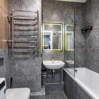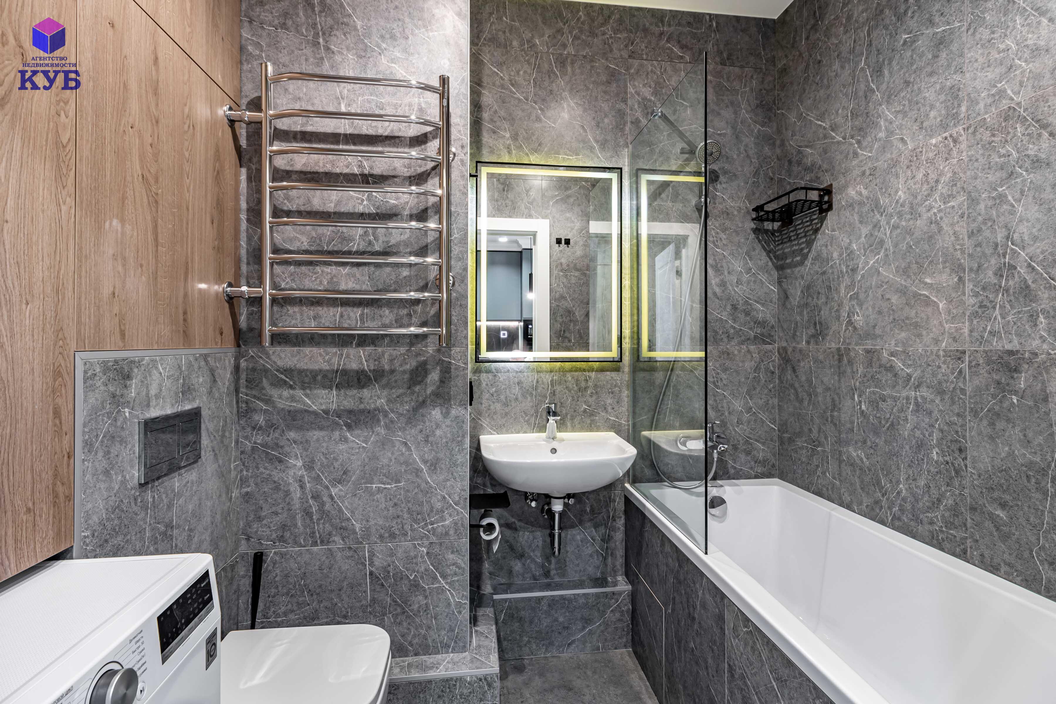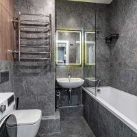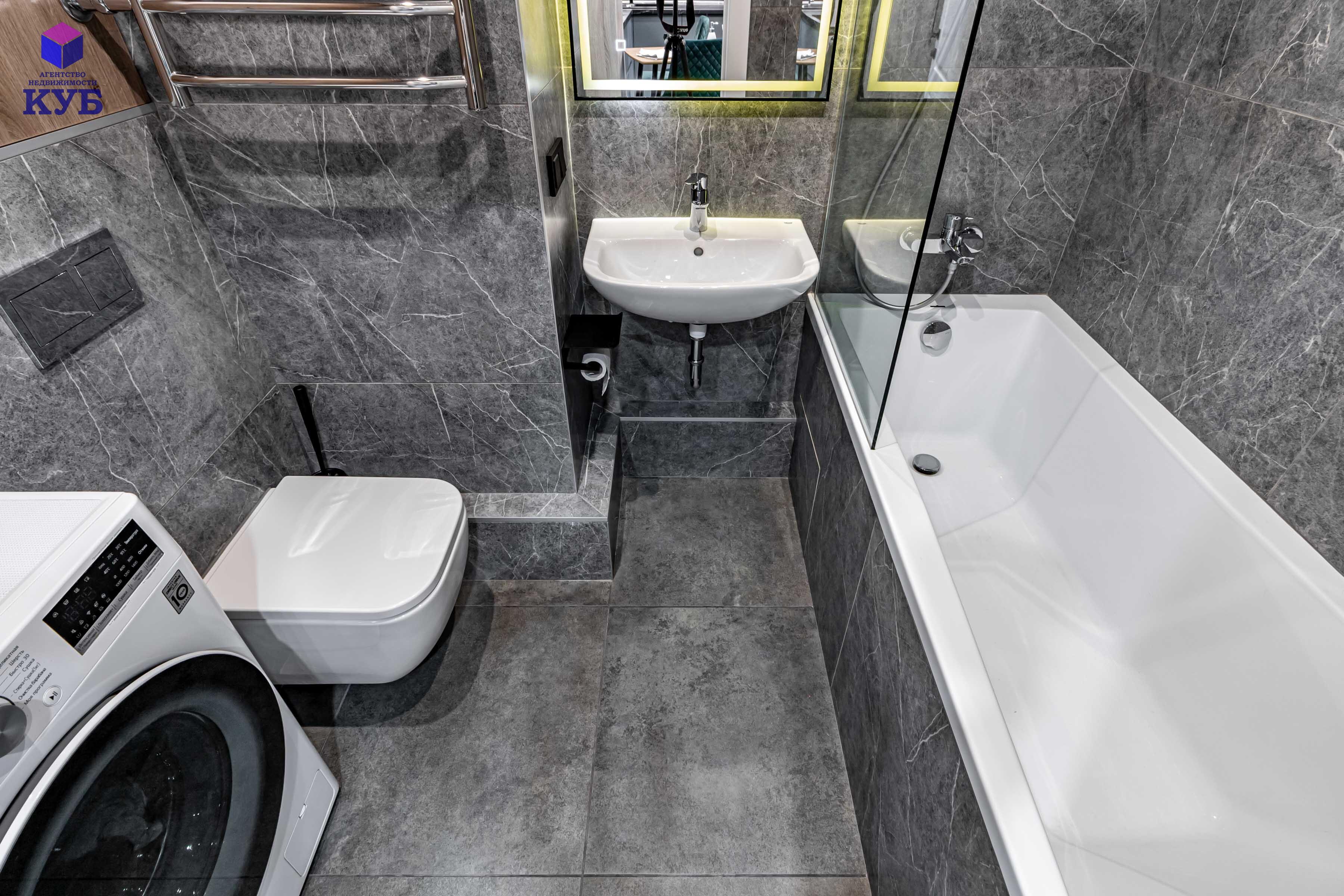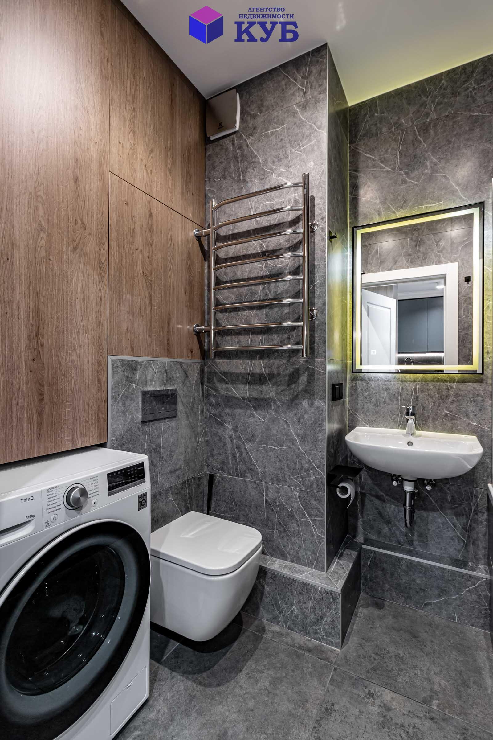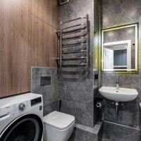 в ванной смесители Grohe, умывальник Grohe, стирально-сушильная машина LG с Wi-Fi;