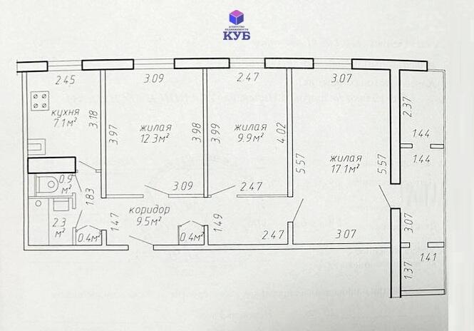 | Плошадь общая / жилая / кухня | 59.9 / 39.3 / 7.1 кв.м. |